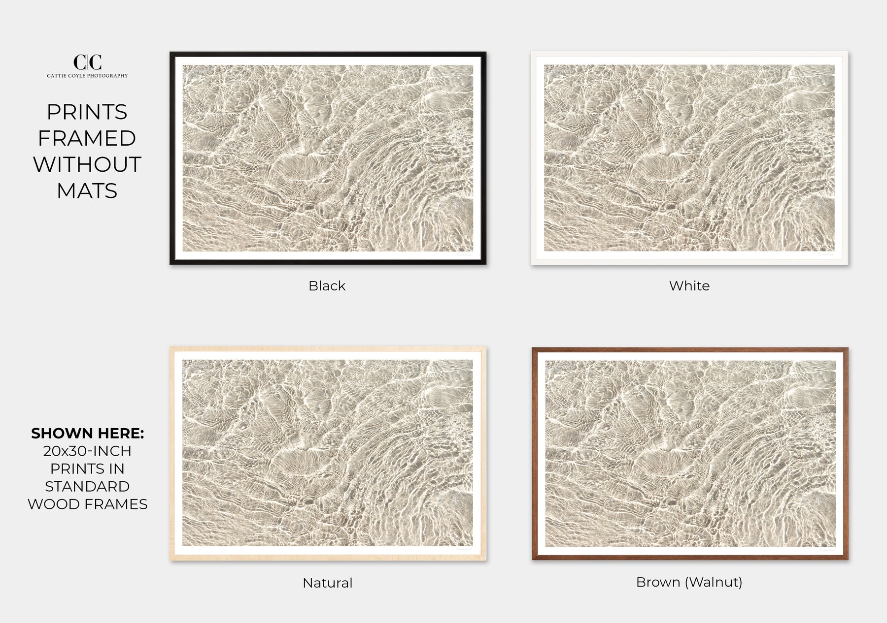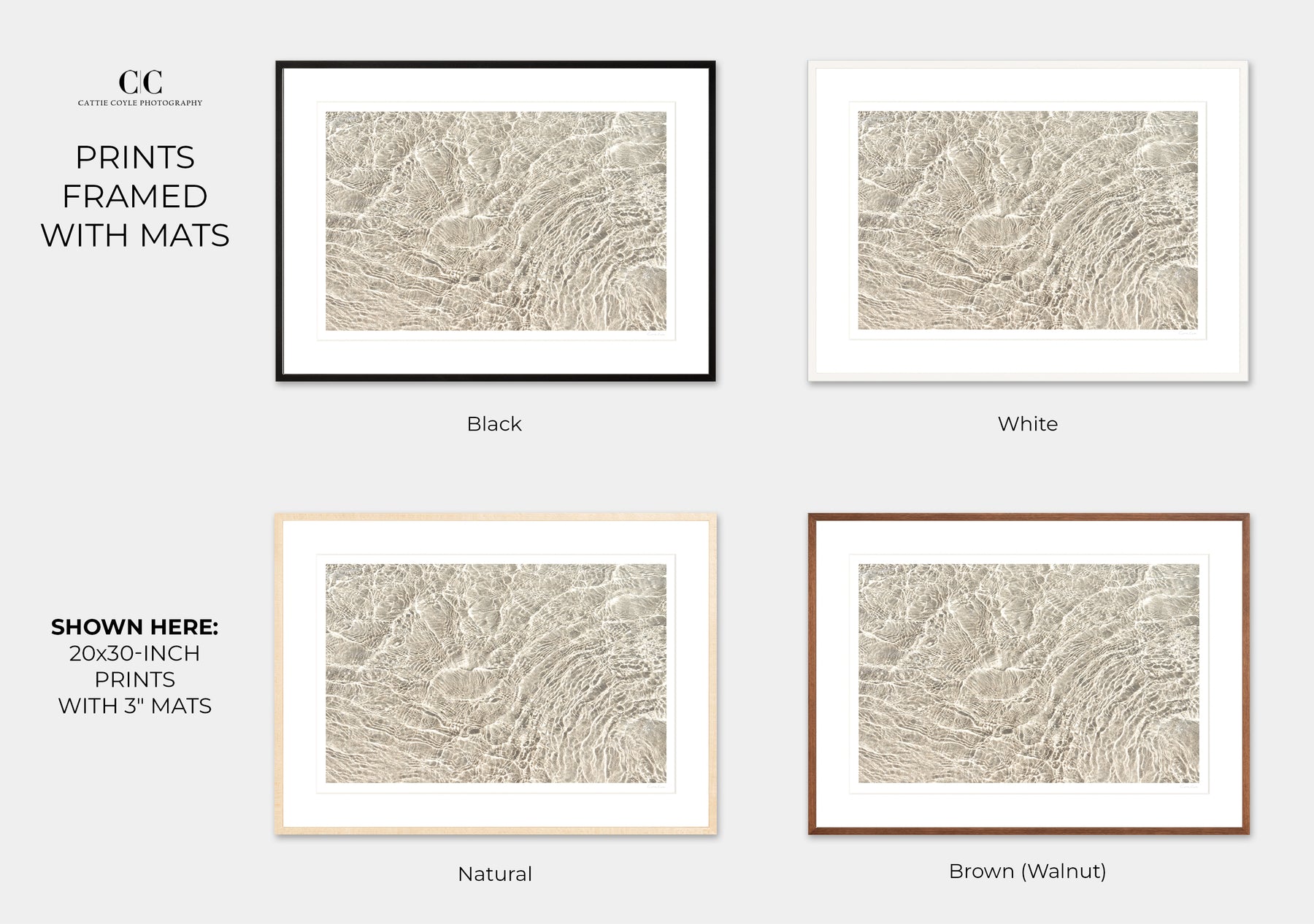 Framed prints come in a black, white, brown or natural wood frame with or without a white cotton rag mat. The frames are handmade in the US from top-quality hardwoods and all archival materials. They are custom made to order, with beautiful spline joints and 99% UV-filtering acrylic glass. Depending on print size, the frames have a 1/2" - 1" face and 1 1/2" - 2 1/4" depth. Smaller frames are fitted with D-rings and a wire for hanging; large frames (24x36 inches and up) have a French cleat hanging system.