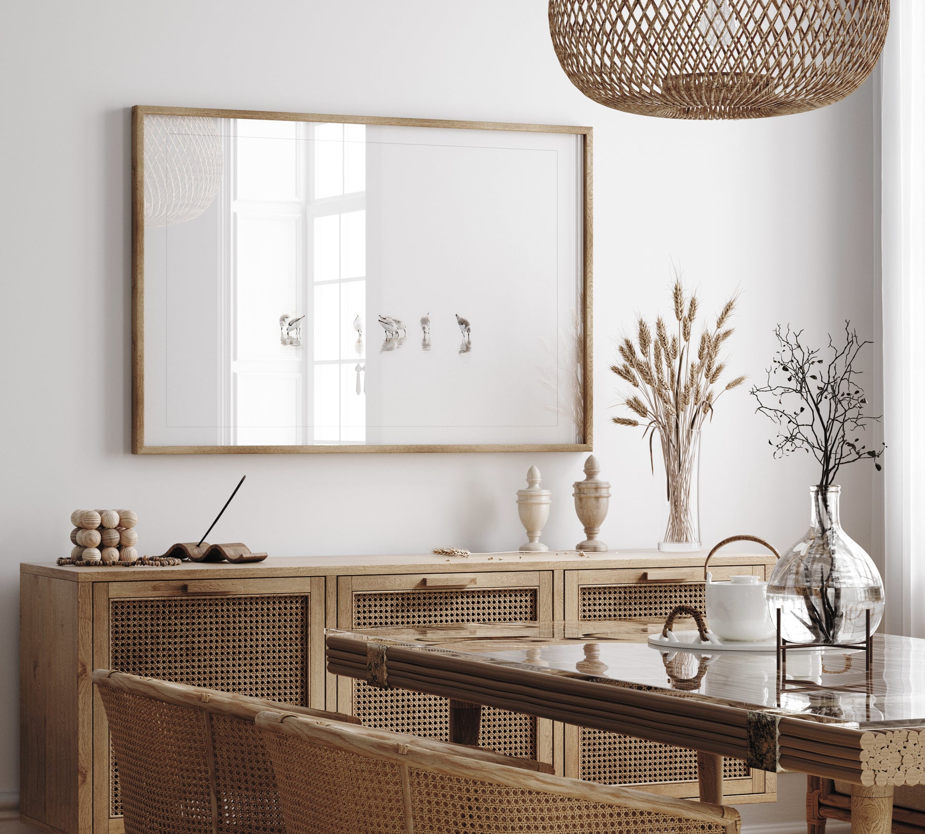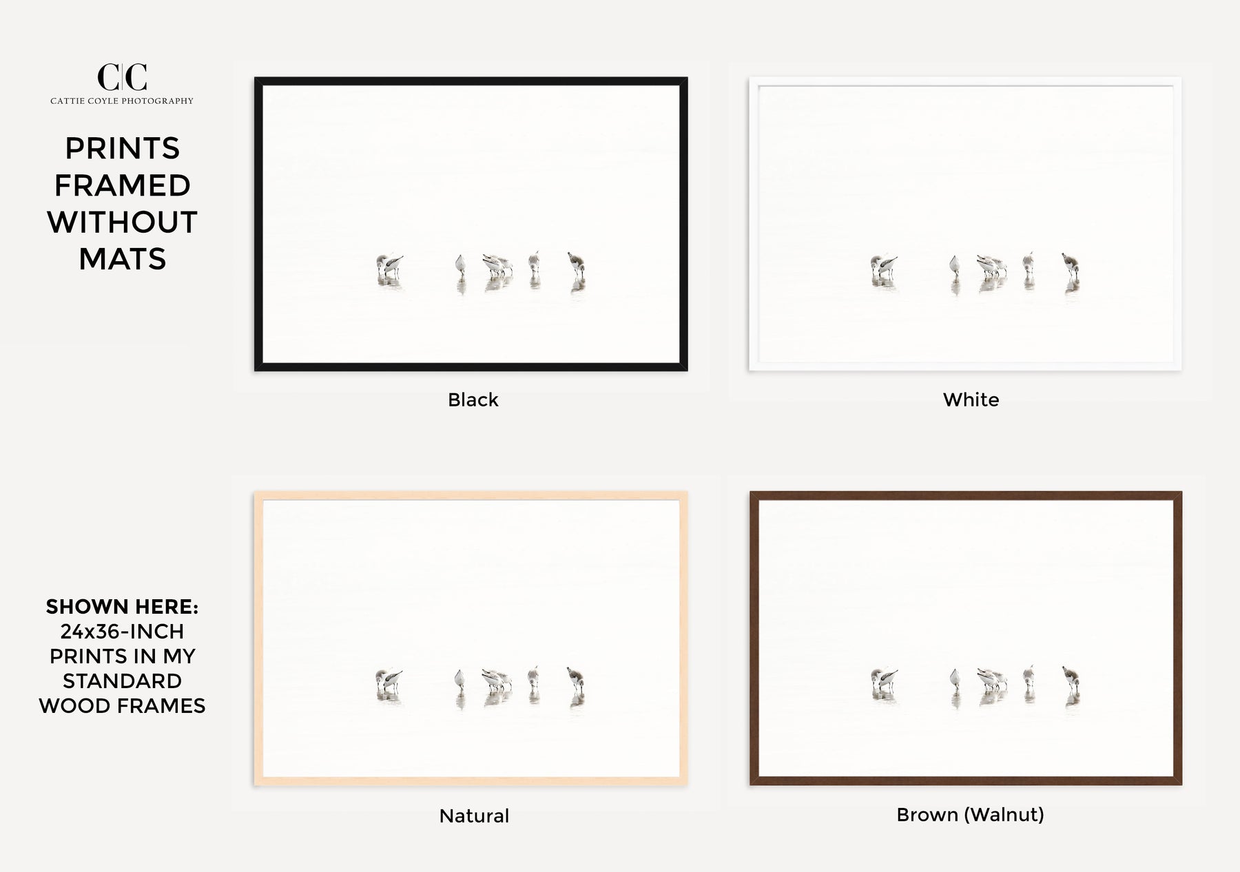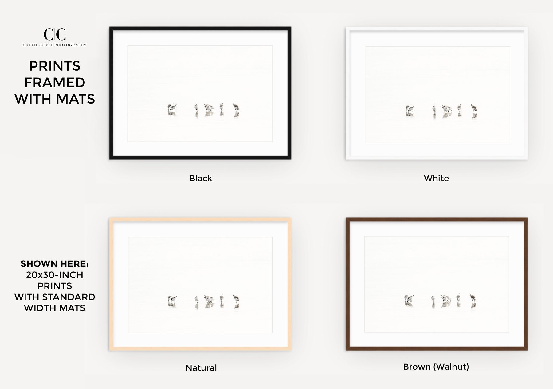 Framed prints come in a black, white, or natural wood frame with or without a white mat. The frames are handmade in the US from top-quality hardwoods and all archival materials. They are custom made to order, with beautiful spline joints and 99% UV-filtering acrylic glass. Depending on print size, the frames have a 1/2" - 1" face and 1 1/2" - 2 1/4" depth. Smaller frames are fitted with D-rings and a wire for hanging; large frames (24x36 inches and up) have a French cleat hanging system.