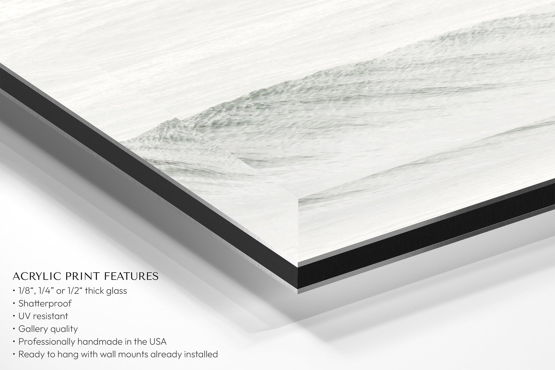 People sometimes call them “photo prints on glass or acrylic”, but there are a couple of different ways to create them, and my acrylic prints are actually not printed ON the acrylic. My lab uses the fine art, gallery-quality “face mounting” method, where the print is placed behind the acrylic and backed with DiBond (a rigid plastic core surrounded by two thin sheets of aluminum), and safely sealed in place. So when you look at the image, you look through the acrylic, and because of how light travels within it, you get a much more vibrant image with depth and colors that really pop. In the right light, it almost has a 3D look (the thicker the acrylic, the more 3D the look). Plus this method also gives you superior results in terms of color accuracy and permanence (no color fading).