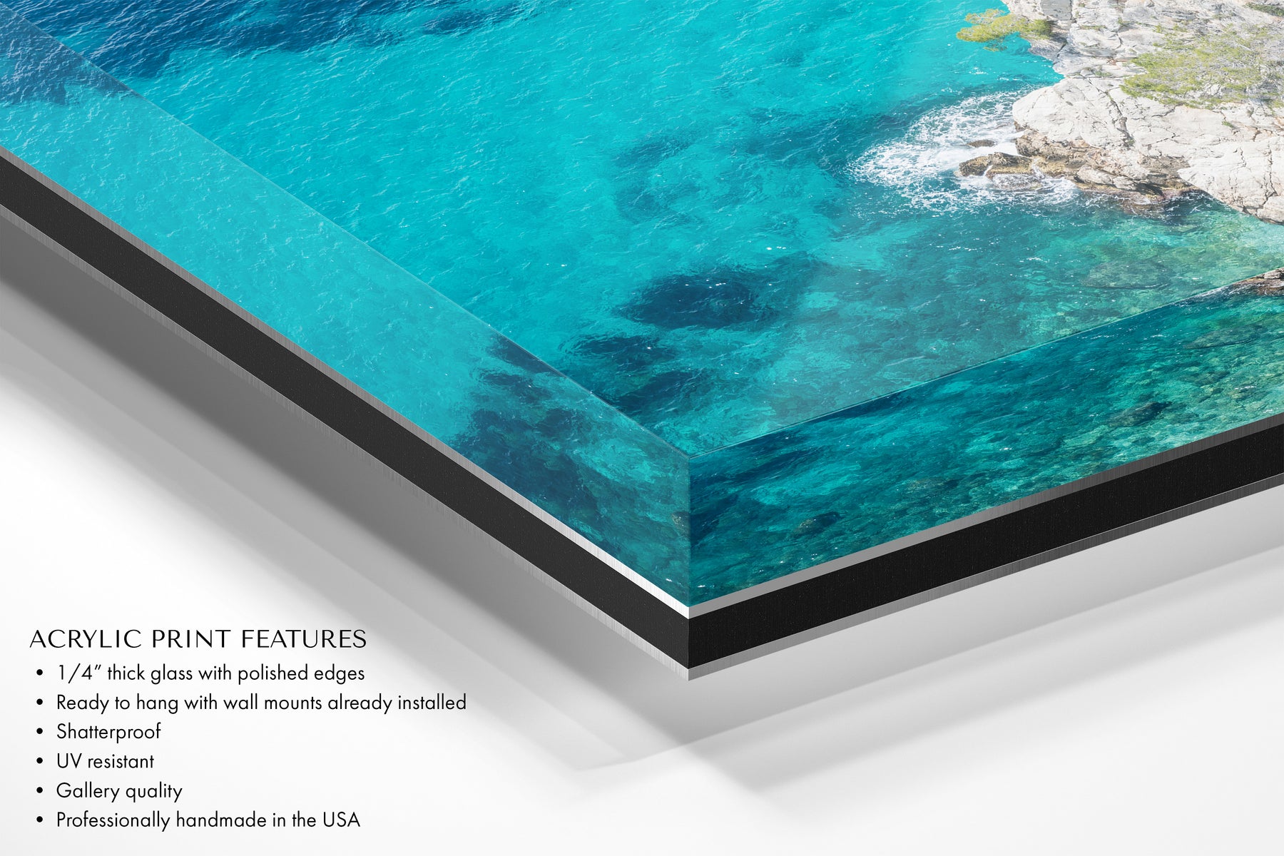 The acrylic glass prints are professionally handmade in the USA, gallery-quality with 1/4” thick glass, and come ready to hang with a wood/wire (prints up to 24x36 inches) or French cleat (30x45 and 40x60 inch prints) hanging system.