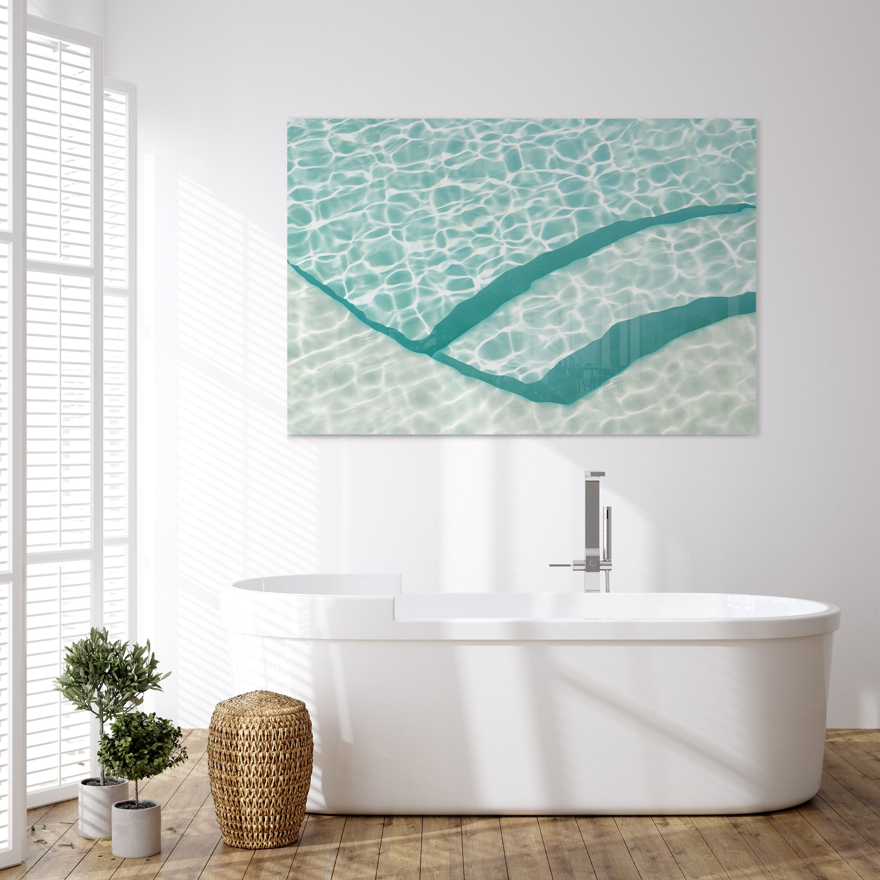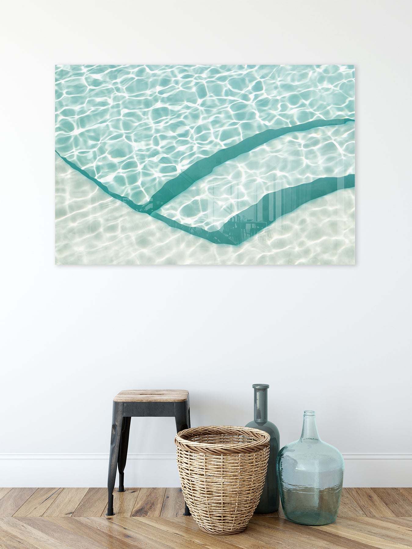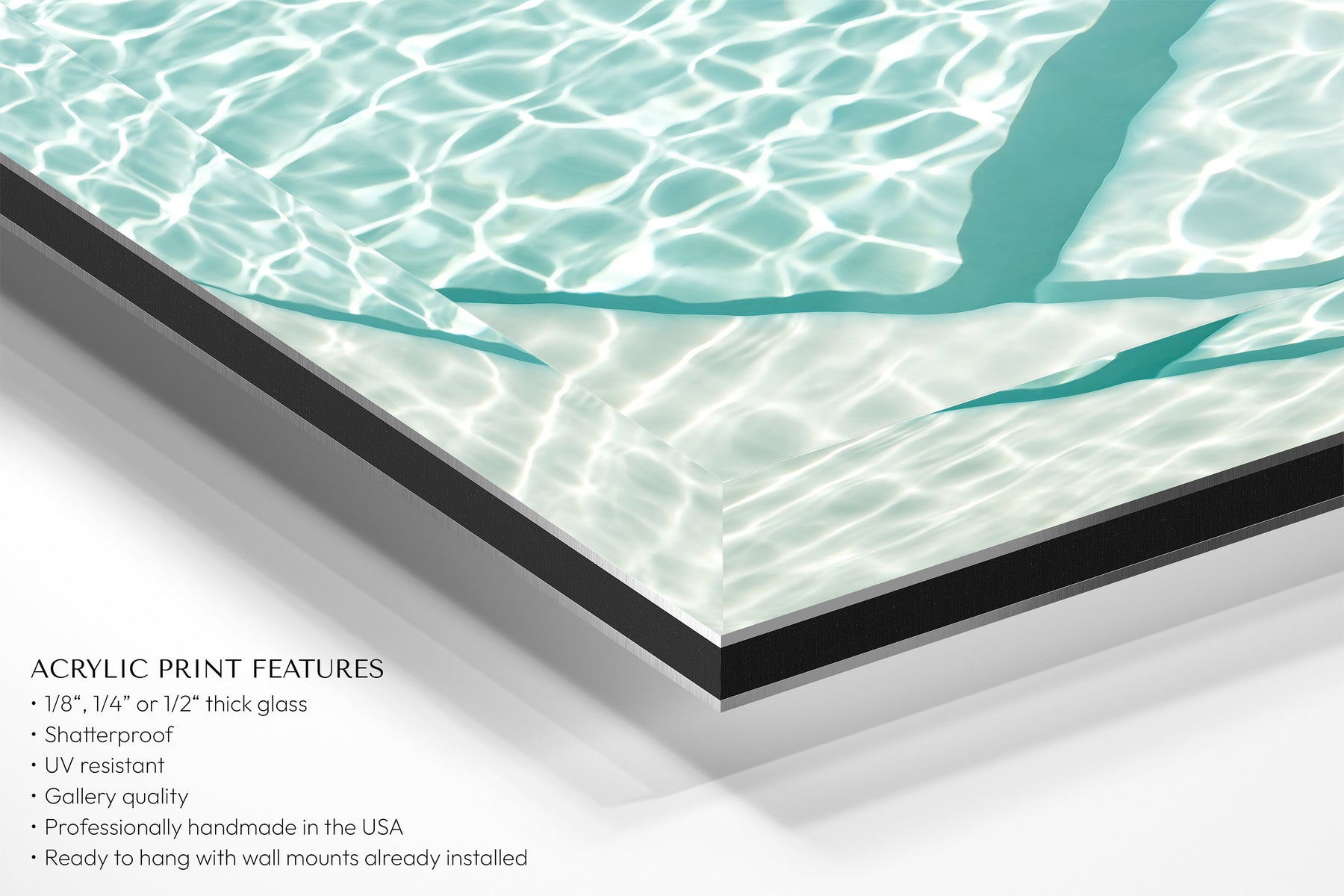 Acrylic glass art print of sunshine and abstract shapes in turquoise swimming pool water on a warm summer day.