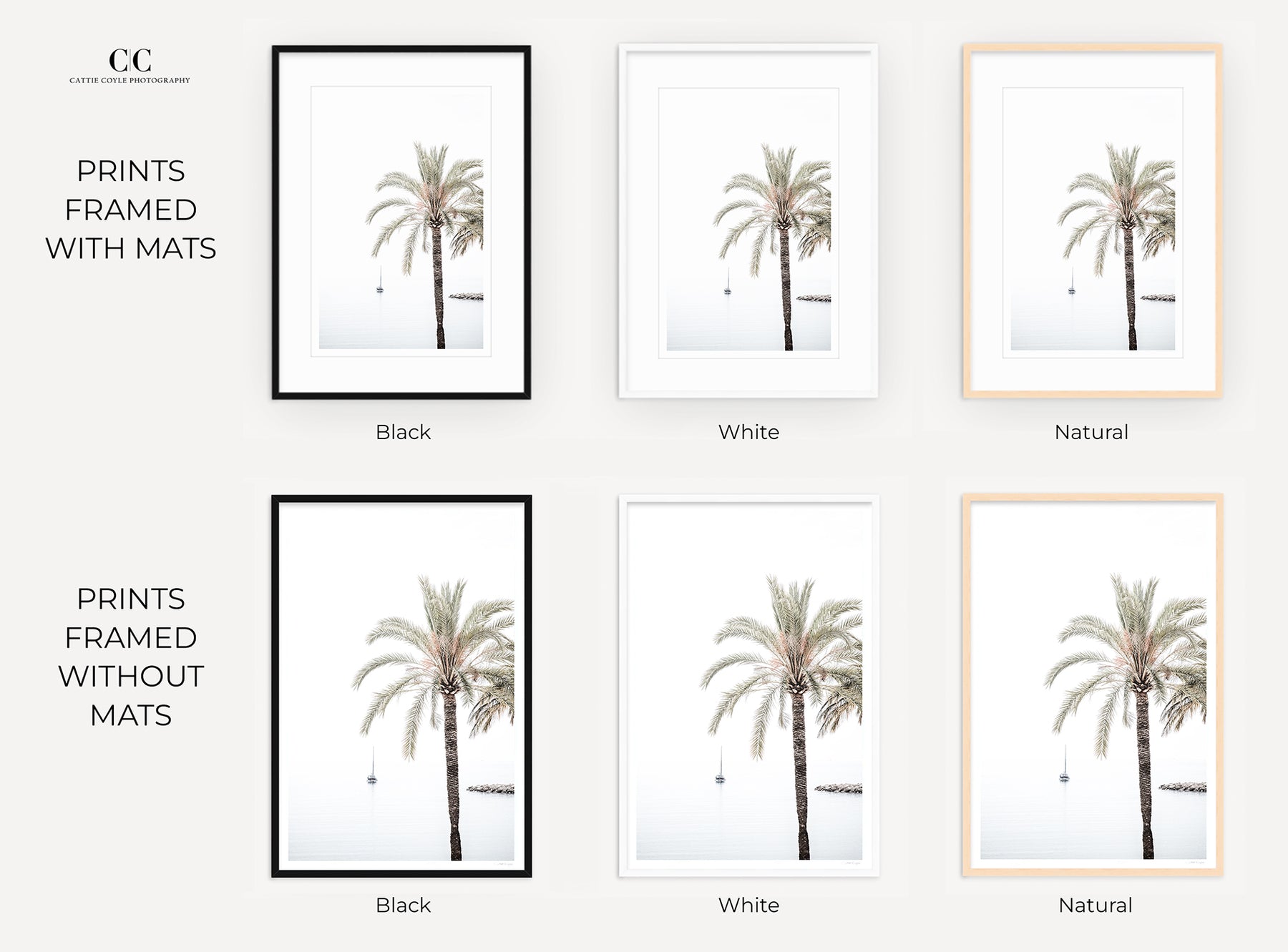 Framed prints come in a black, white, or natural wood frame with or without a white mat. The frames are handmade in the US from top-quality hardwoods and all archival materials. They are custom made to order, with beautiful spline joints and 99% UV-filtering acrylic glass. Depending on print size, the frames have a 1/2" - 1" face and 1 1/2" - 2 1/4" depth. Smaller frames are fitted with D-rings and a wire for hanging; large frames (24x36 inches and up) have a French cleat hanging system.