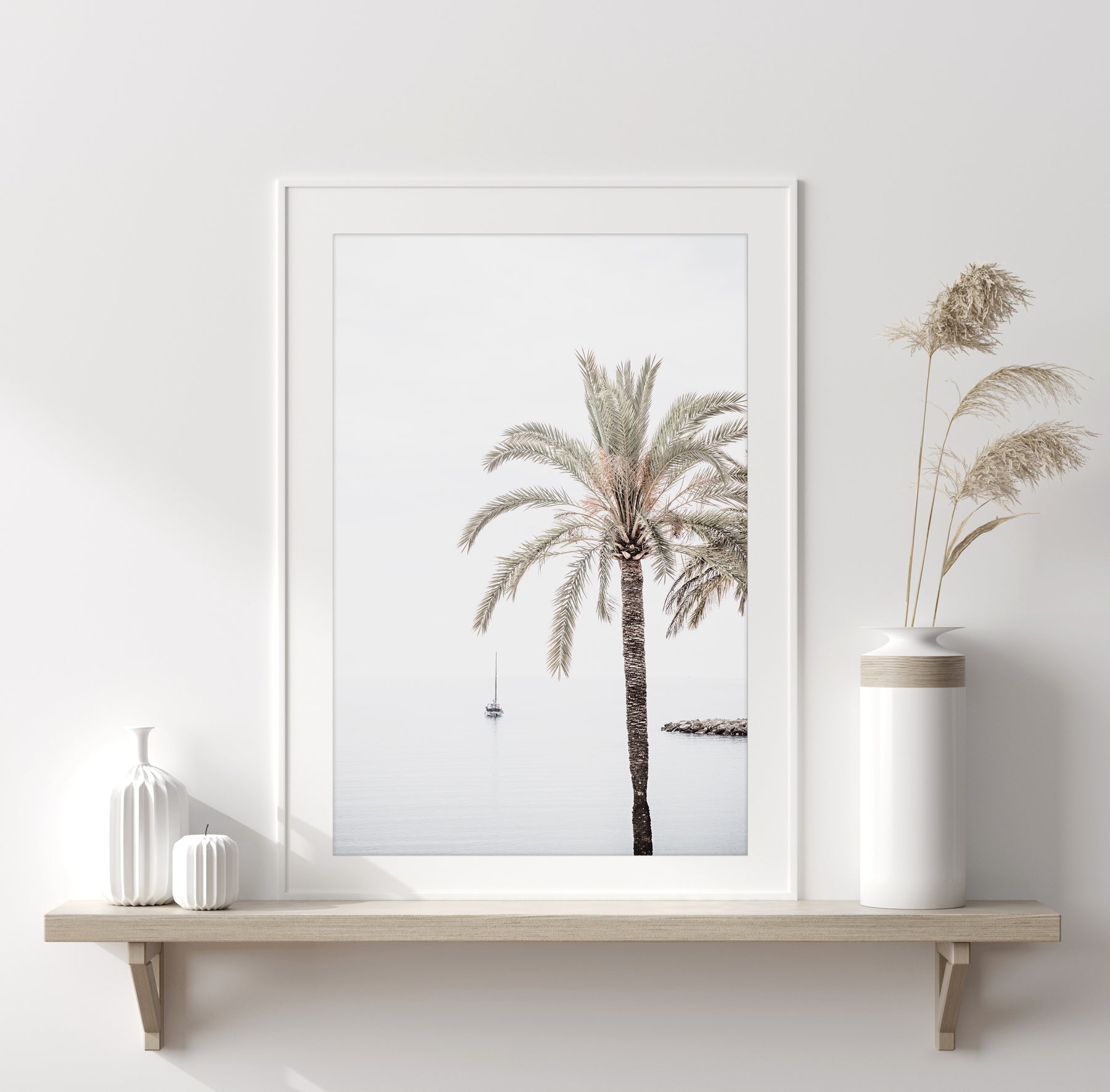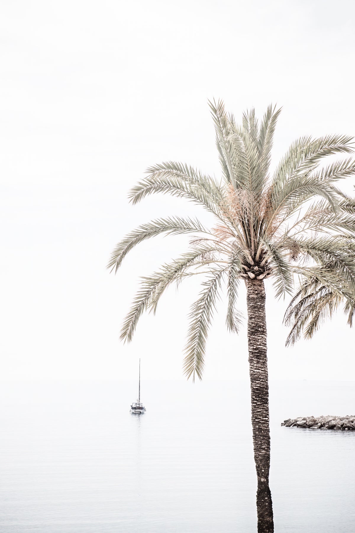 Palm tree, pier and sailboat on a calm morning in Menton, France.
