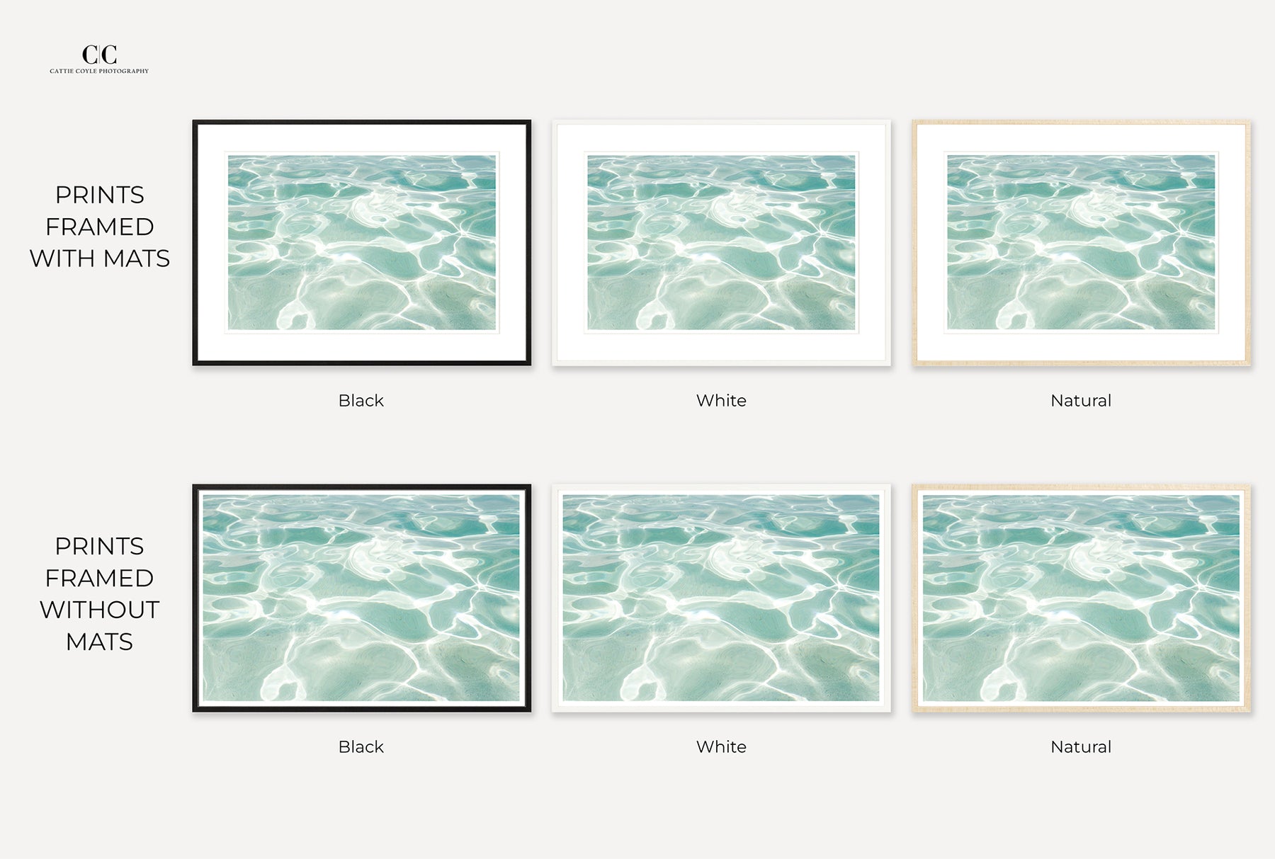 Framed prints come in a black, white, or natural wood frame with or without a white cotton rag mat. The frames are handmade in the US from top-quality hardwoods and all archival materials. They are custom made to order, with beautiful spline joints and 99% UV-filtering acrylic glass. Depending on print size, the frames have a 1/2" - 1" face and 1 1/2" - 2 1/4" depth. Smaller frames are fitted with D-rings and a wire for hanging; large frames (24x36 inches and up) have a French cleat hanging system.