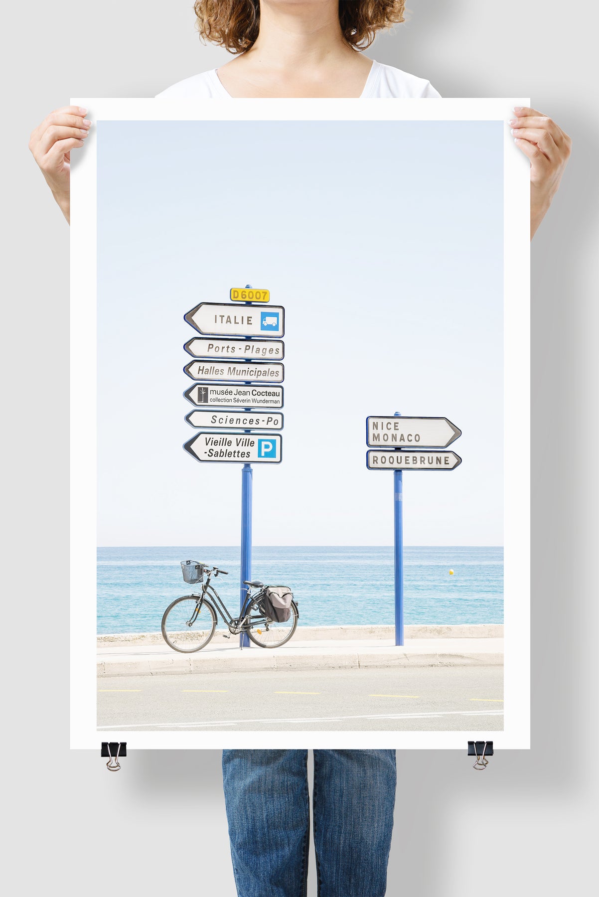 Bicycle, road signs, and the Mediterranean in Menton, France.