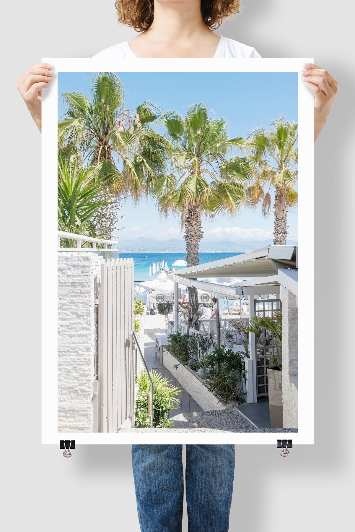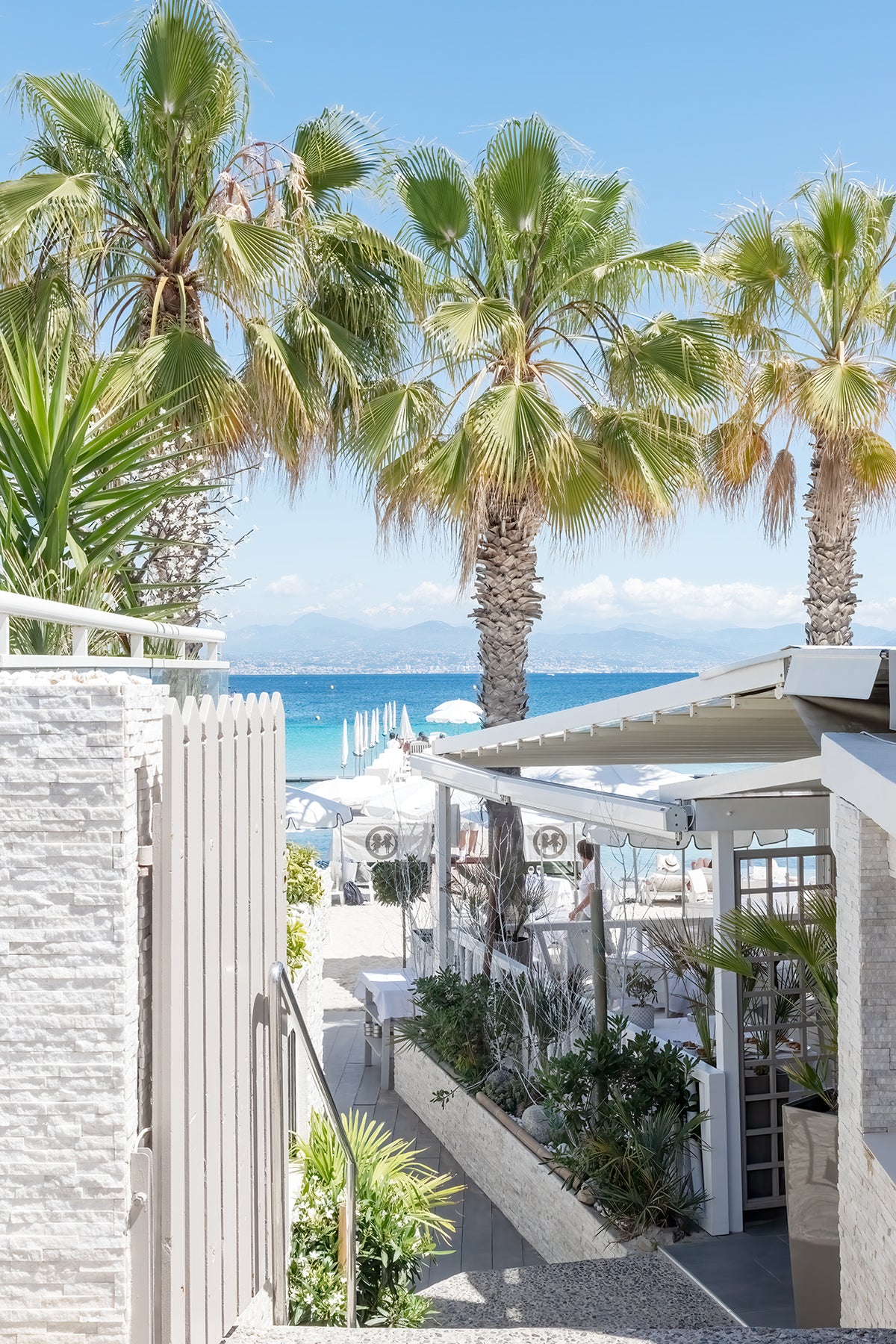 Palm trees and turquoise water at the beautiful beach Plage Keller on Cap d’Antibes, France.
