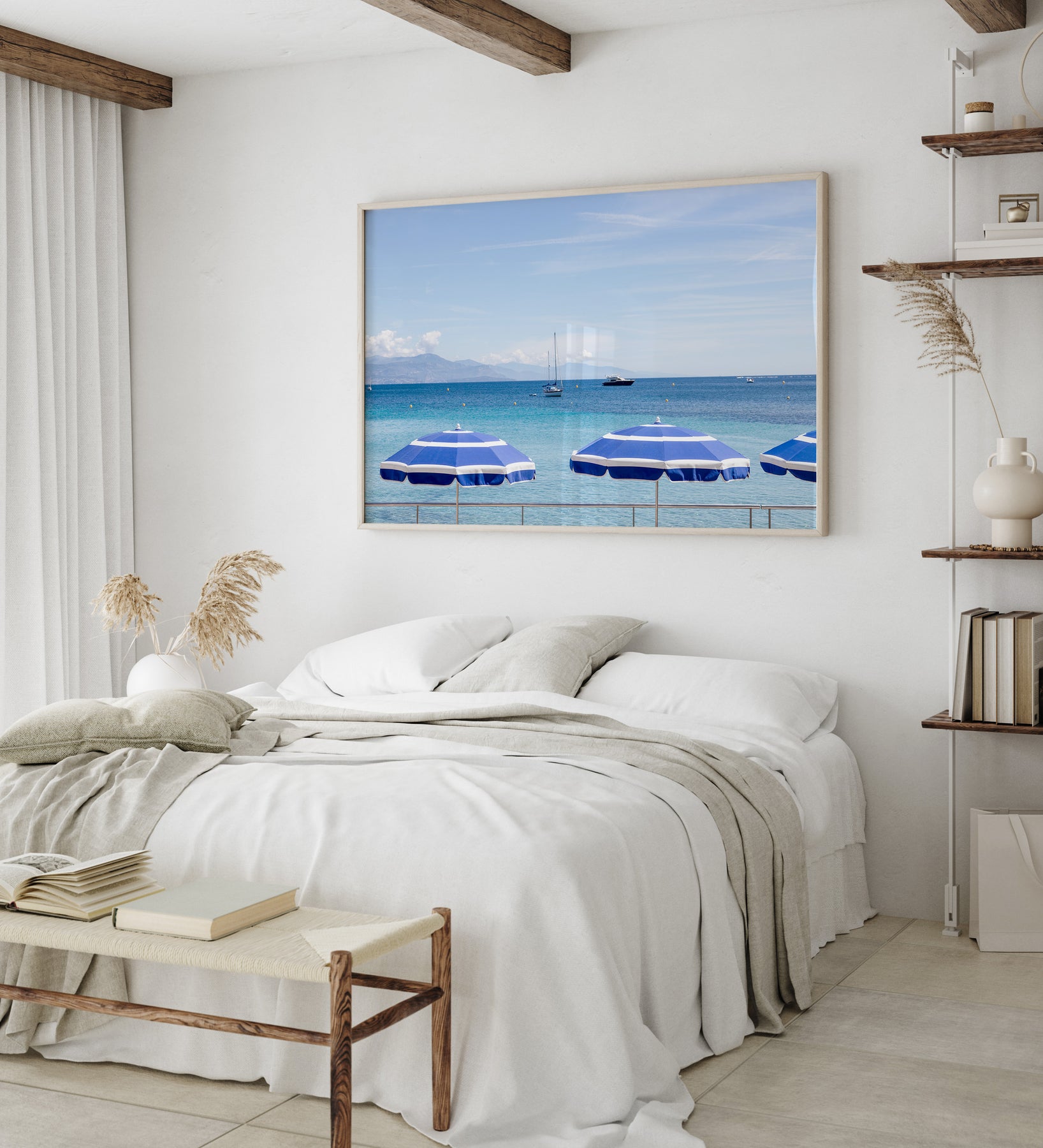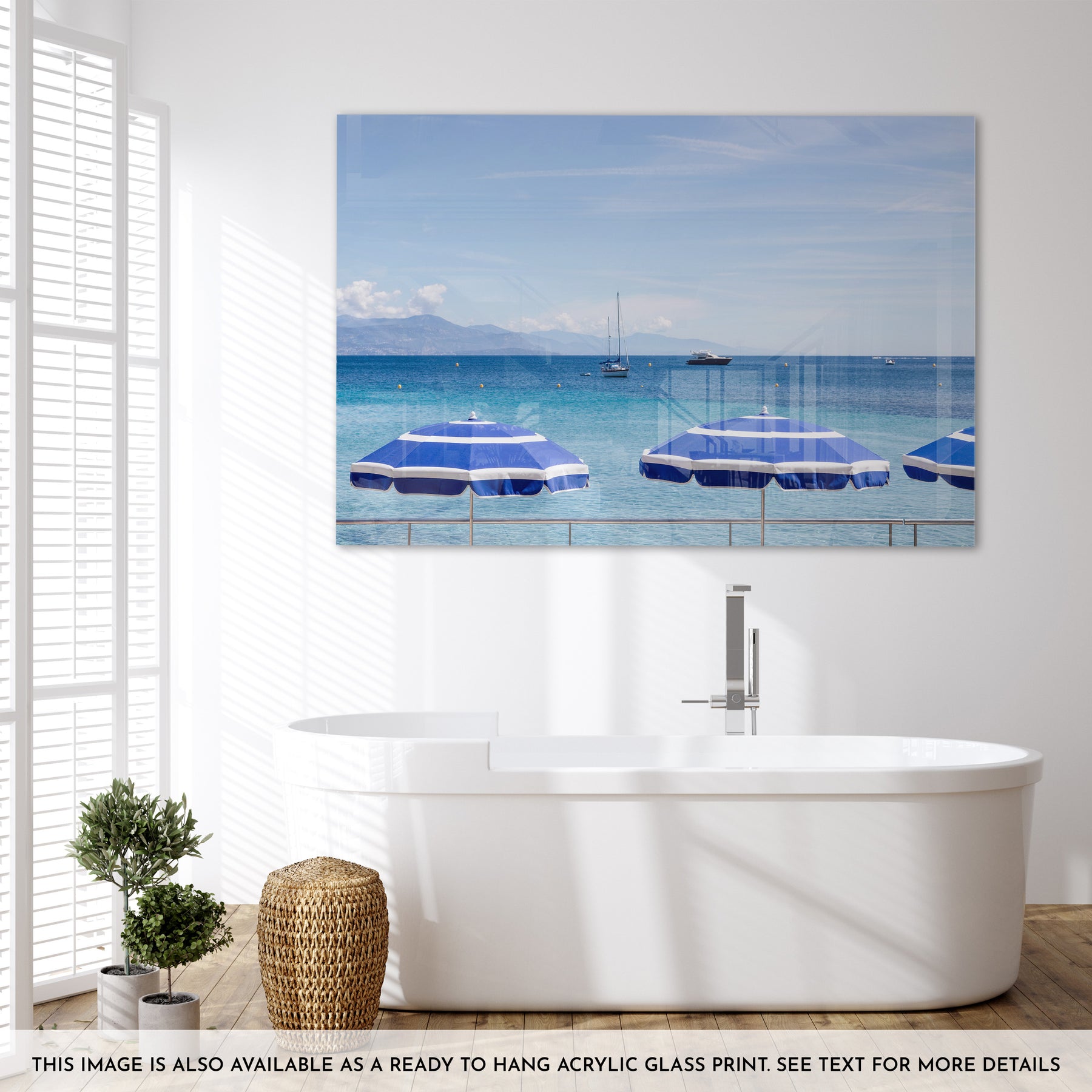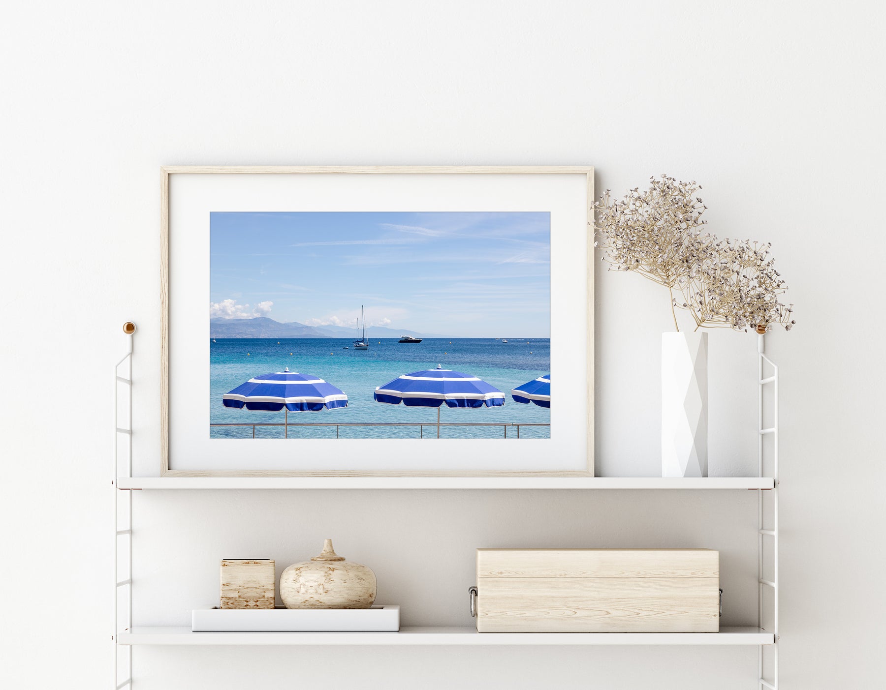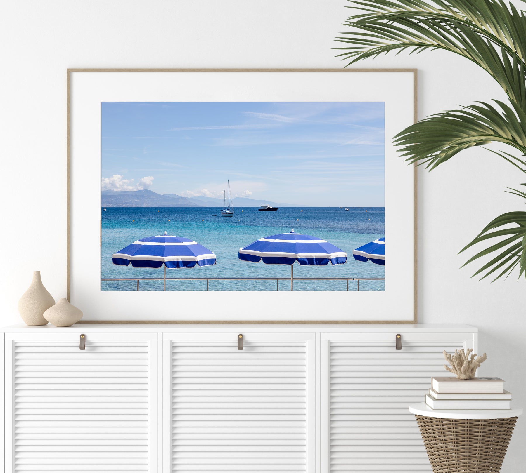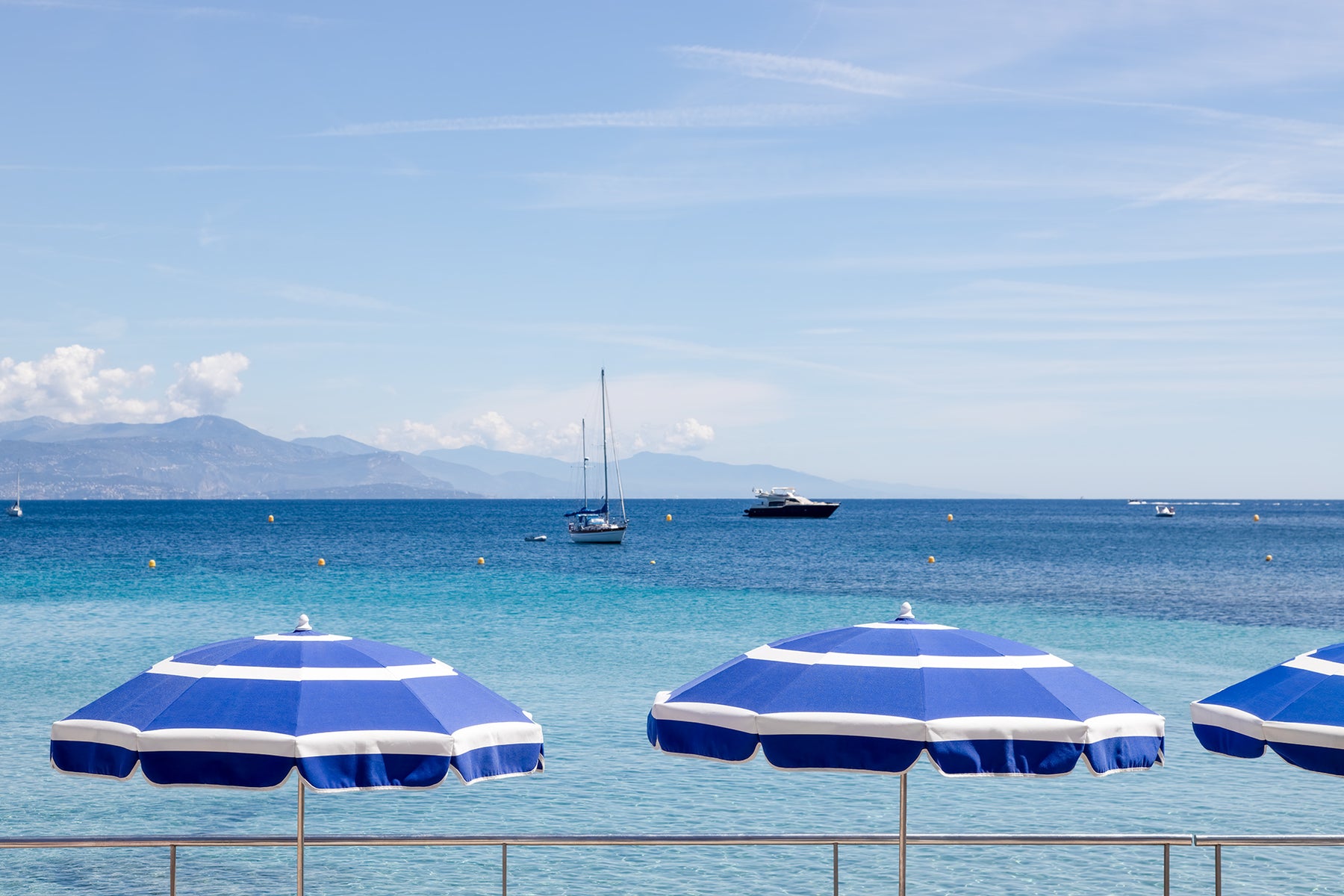 Blue umbrellas and turquoise water at Plage de la Garoupe on Cap d’Antibes, France.