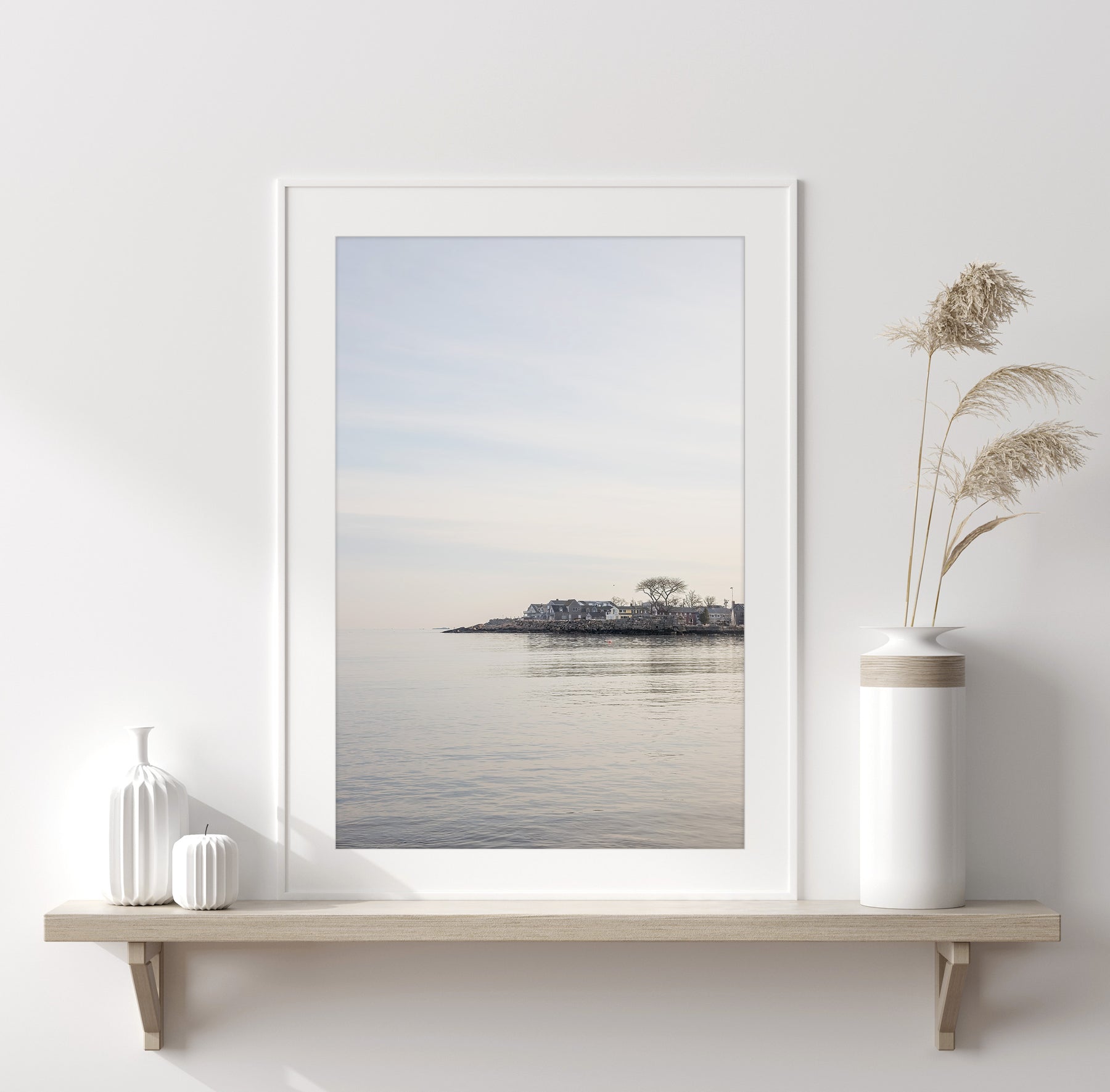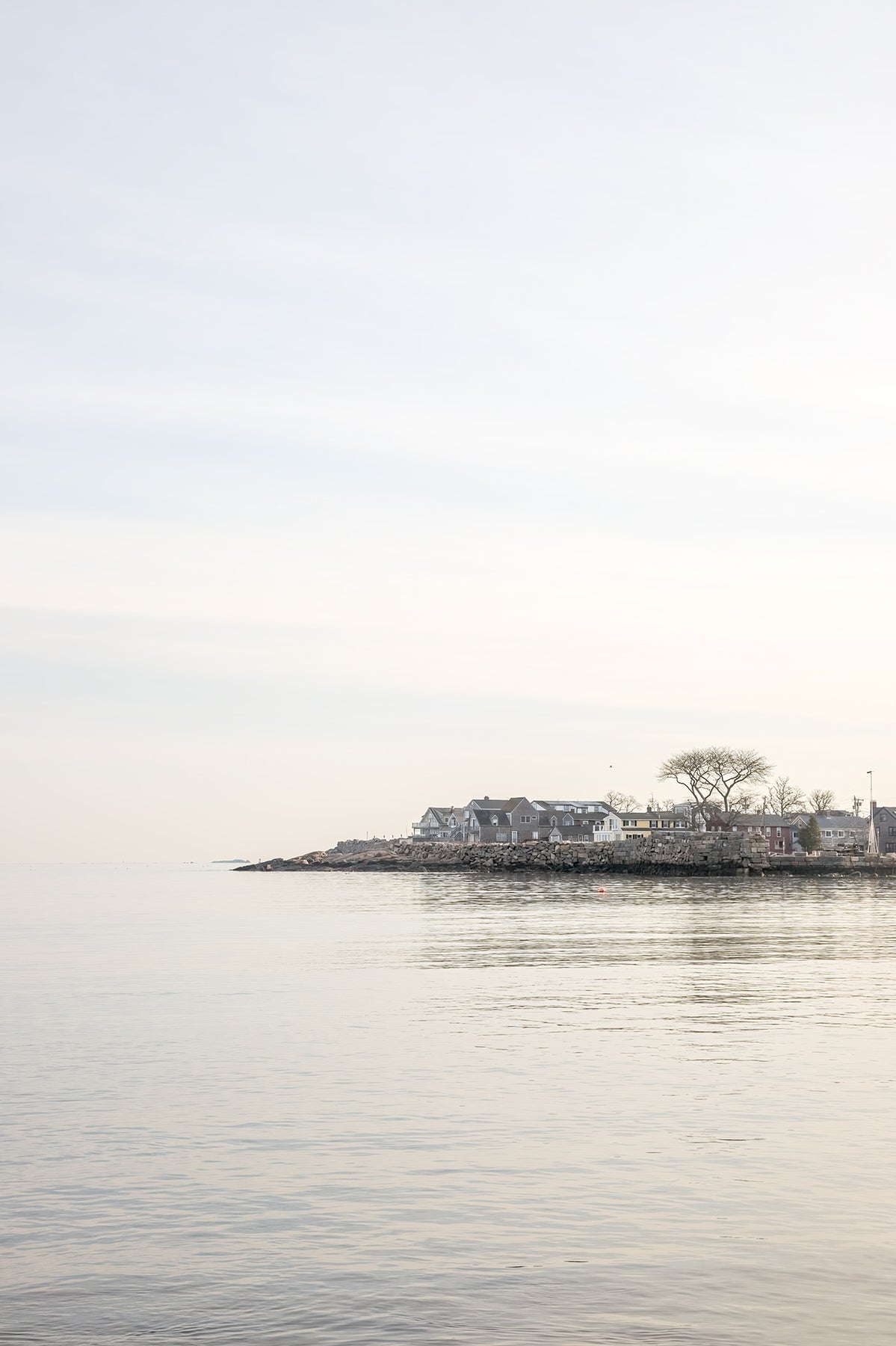 View across the water of Bearskin Neck in Rockport, MA, on a calm winter day.