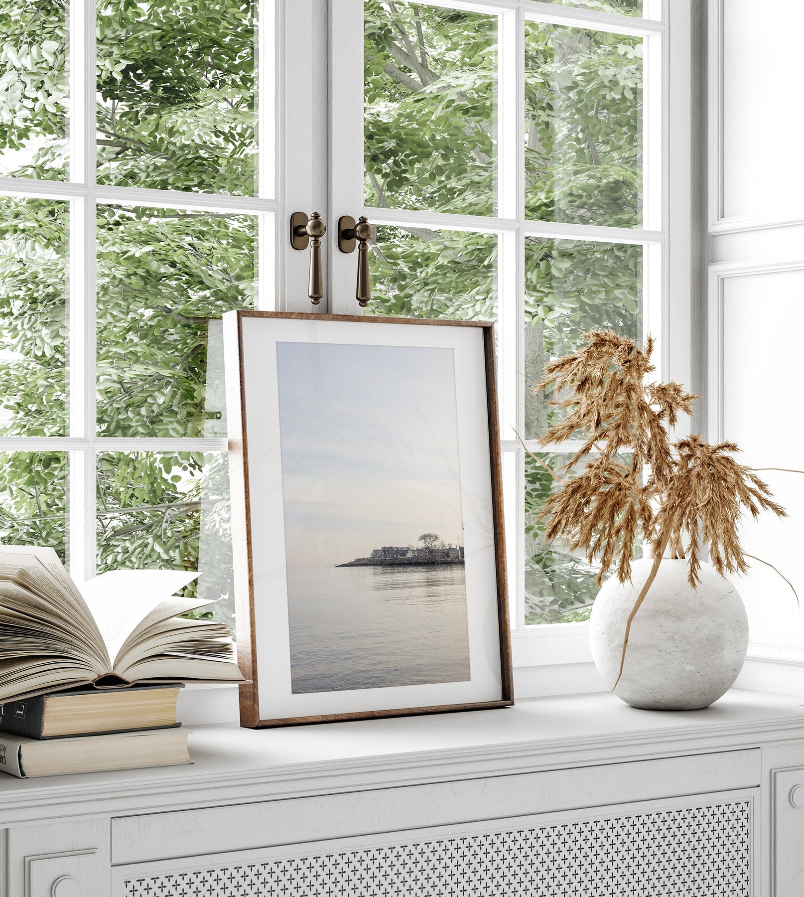 Framed prints come in a black, white, brown or natural wood frame with or without a white cotton rag mat. The frames are handmade in the US from top-quality hardwoods and all archival materials. They are custom made to order, with beautiful spline joints and 99% UV-filtering acrylic glass. Depending on print size, the frames have a 1/2" - 1" face and 1 1/2" - 2 1/4" depth. Smaller frames are fitted with D-rings and a wire for hanging; large frames (24x36 inches and up) have a French cleat hanging system.