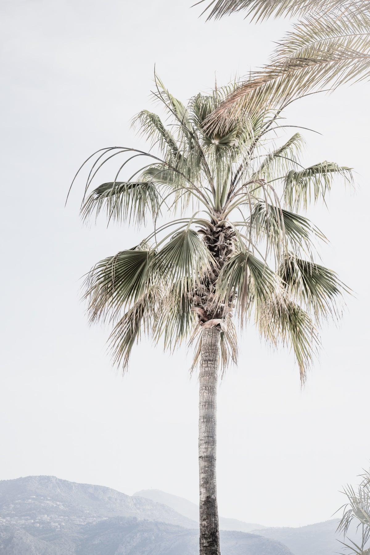 Palm tree and hazy mountains on the French Riviera.