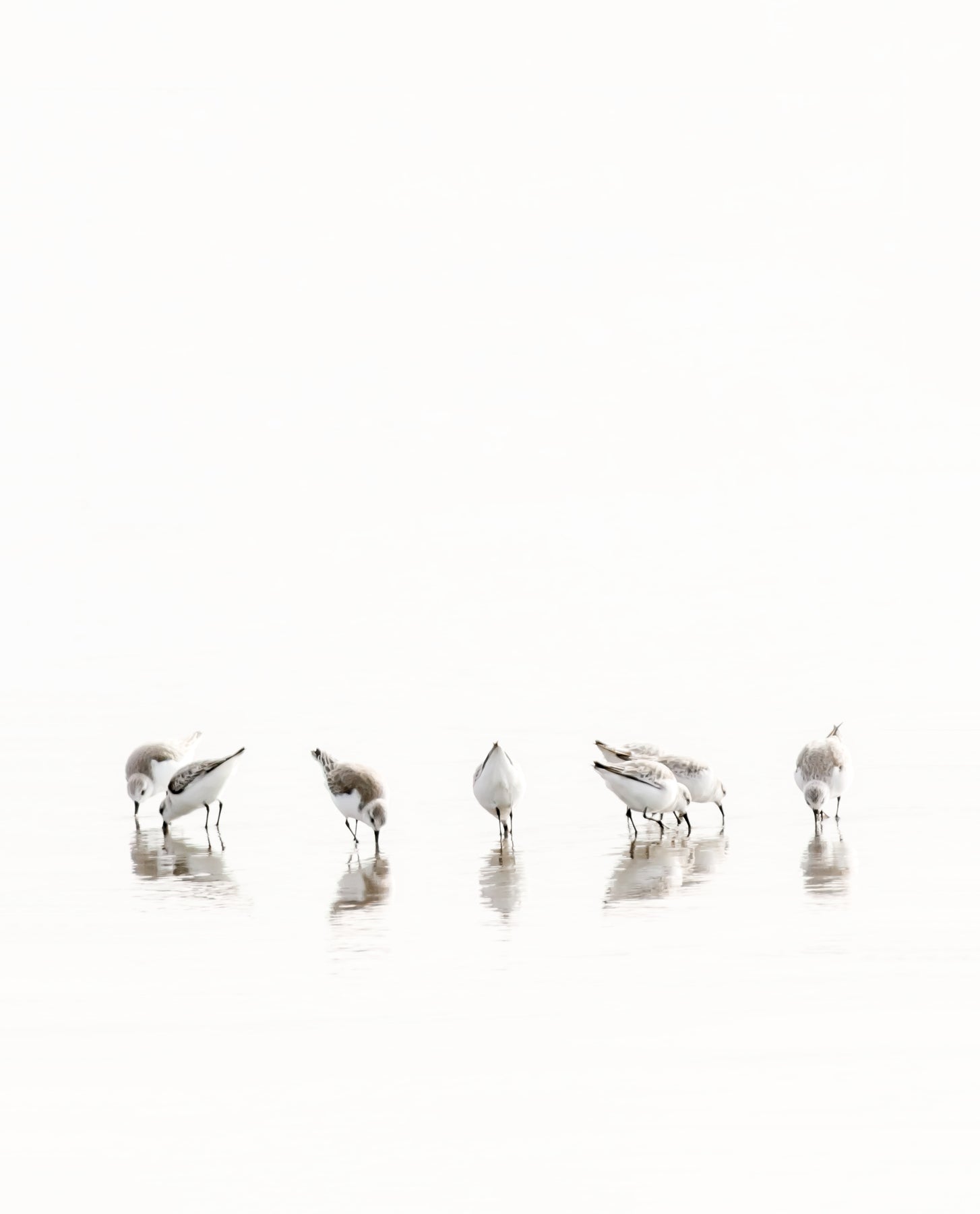 A group of Sandpipers and their reflections in the shallow water on the beach.