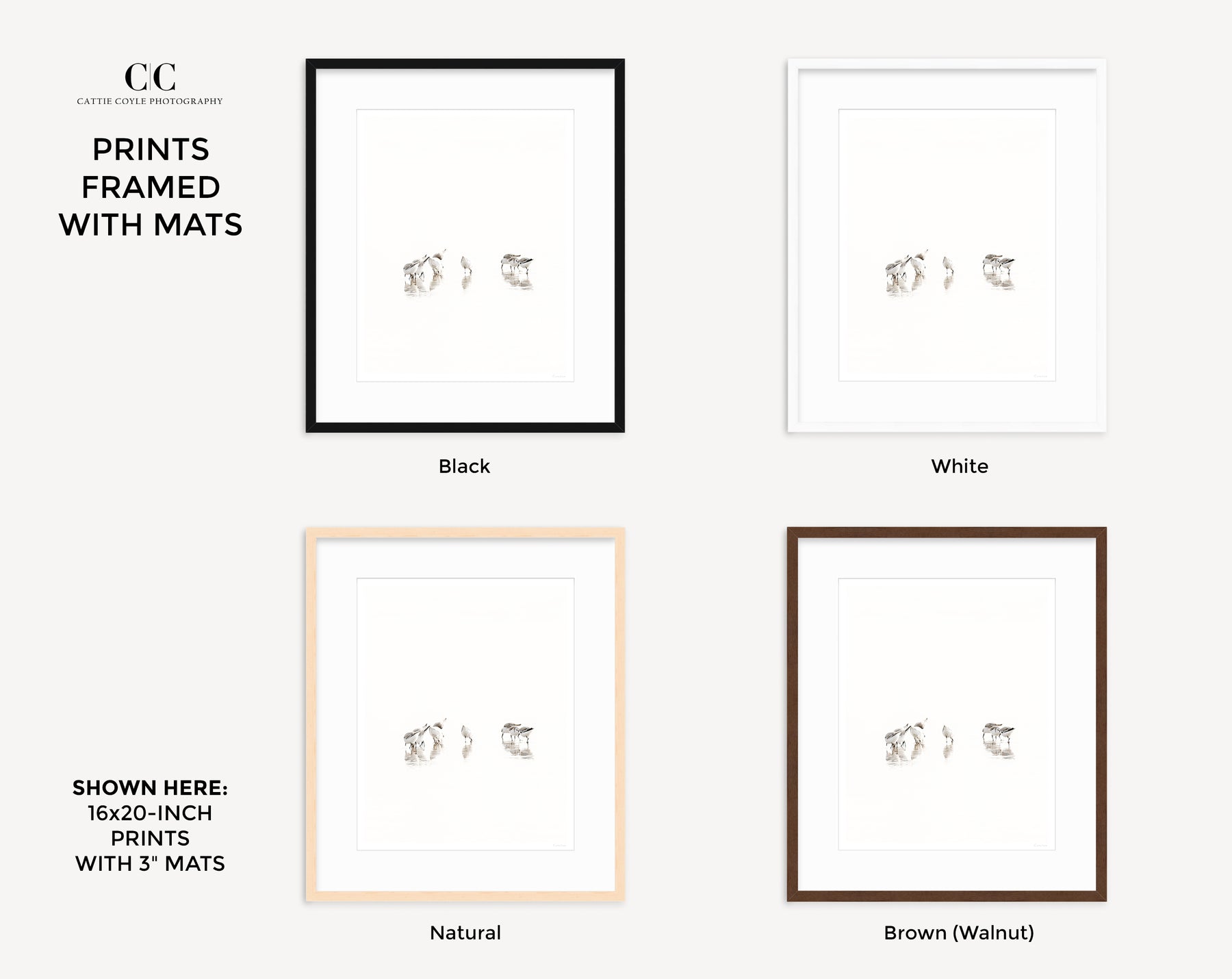 The sizes listed are print sizes; mats and frames will add to the final size.For example, the final outside dimensions of an 8x10-inch matted and framed print is 12x14 inches. Please see the framed art size image here (this is a 4:5 ratio print), or the FAQs for all final framed dimensions.