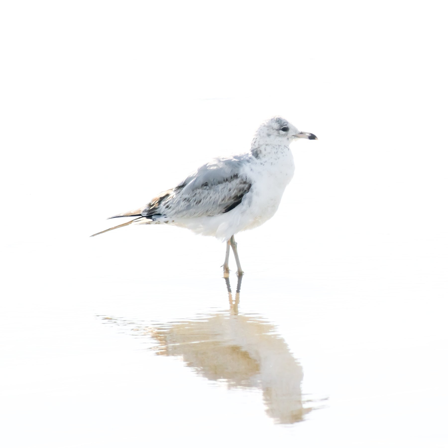 A young ring-billed gull and its reflection in shallow water at the beach.