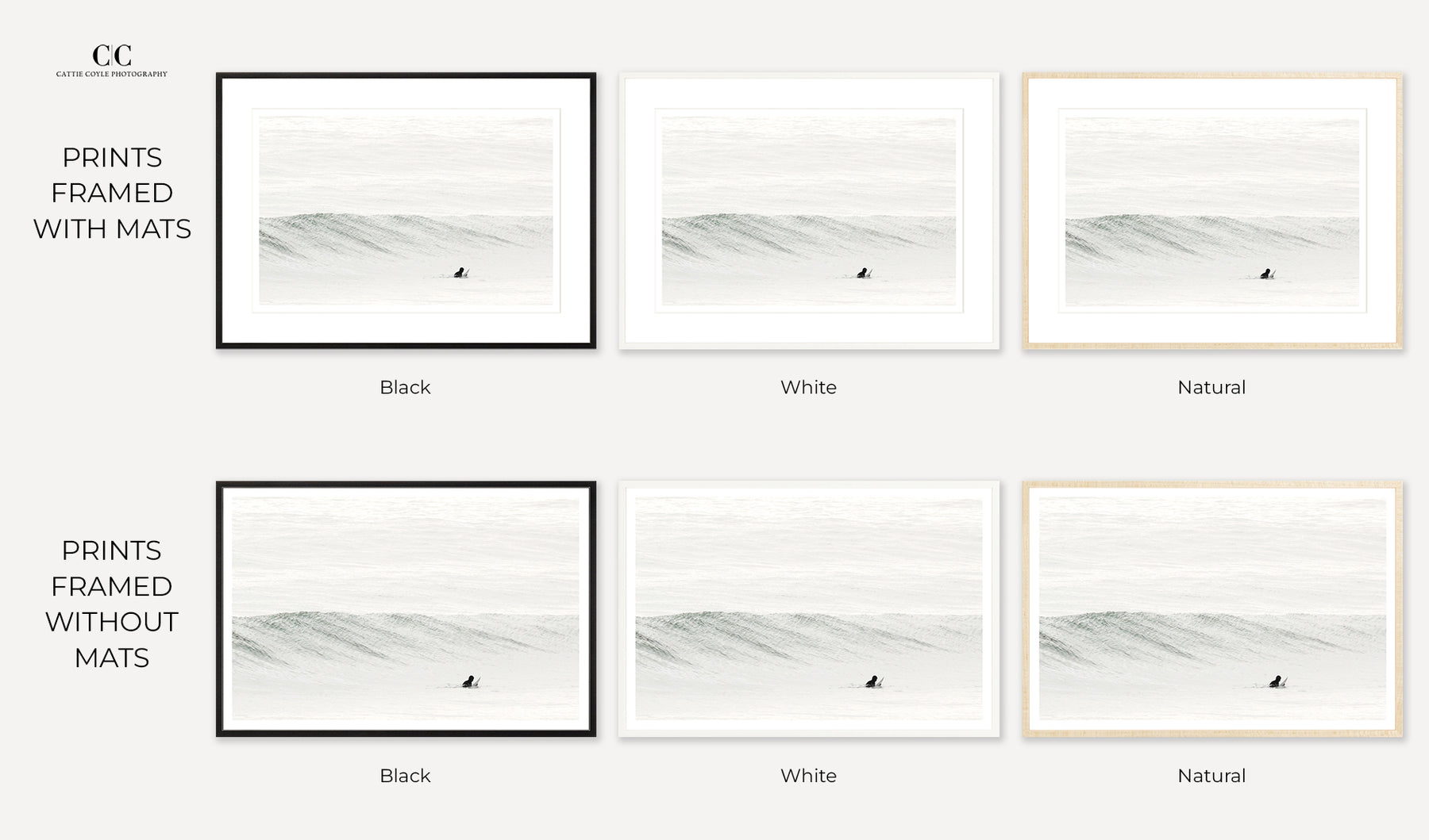 Framed prints come in a black, white, or natural wood frame with or without a white mat. The frames are handmade in the US from top-quality hardwoods and all archival materials. They are custom made to order, with beautiful spline joints and 99% UV-filtering acrylic glass. Depending on print size, the frames have a 1/2" - 1" face and 1 1/2" - 2 1/4" depth. Smaller frames are fitted with D-rings and a wire for hanging; large frames (24x36 inches and up) have a French cleat hanging system.