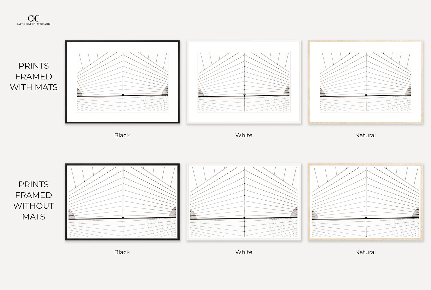 Framed prints come in a black, white, or natural wood frame with or without a white mat. The frames are handmade in the US from top-quality hardwoods and all archival materials. They are custom made to order, with beautiful spline joints and 99% UV-filtering acrylic glass. Depending on print size, the frames have a 1/2" - 1" face and 1 1/2" - 2 1/4" depth. Smaller frames are fitted with D-rings and a wire for hanging; large frames (24x36 inches and up) have a French cleat hanging system.