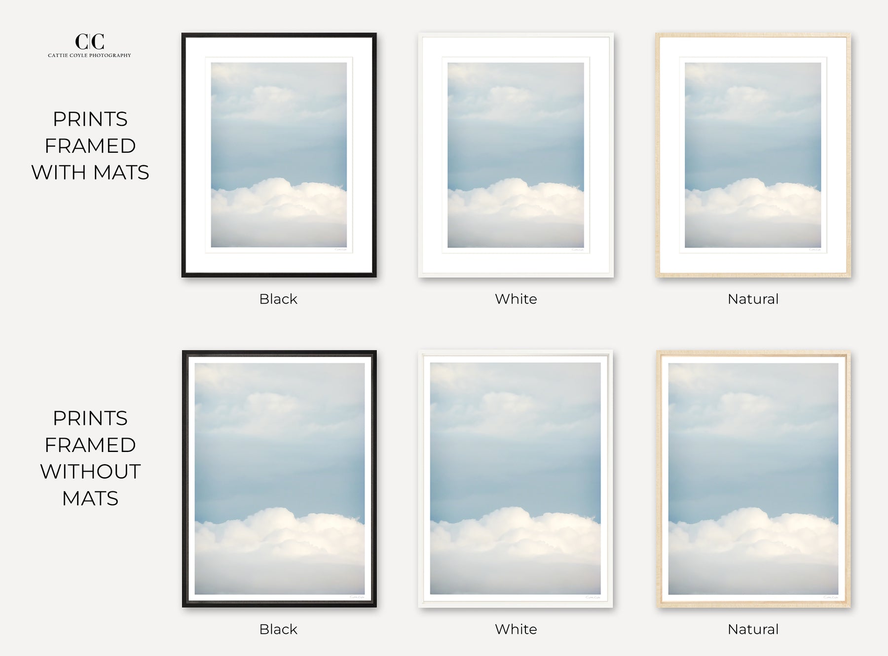 The sizes listed are print sizes; mats and frames will add to the final size. For example, the outside dimensions of a 24x32-inch matted and framed print is 30x38 inches. Please see the image with the framed art size chart (this is a 3:4 ratio print), or the FAQs for all final framed dimensions