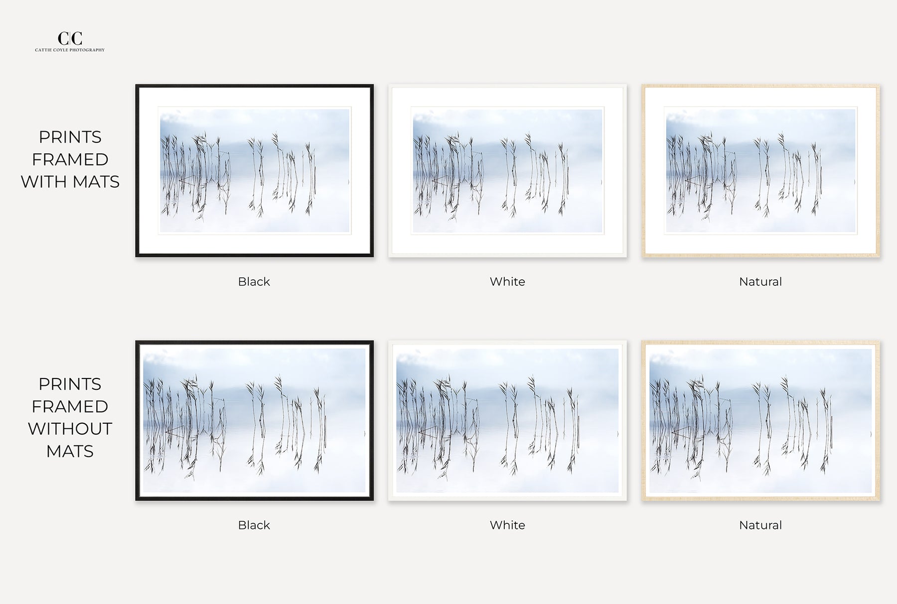 Framed prints come in a black, white, or natural wood frame with or without a white mat. The frames are handmade in the US from top-quality hardwoods and all archival materials. They are custom made to order, with beautiful spline joints and 99% UV-filtering acrylic glass. Depending on print size, the frames have a 1/2" - 1" face and 1 1/2" - 2 1/4" depth. Smaller frames are fitted with D-rings and a wire for hanging; large frames (24x36 inches and up) have a French cleat hanging system.